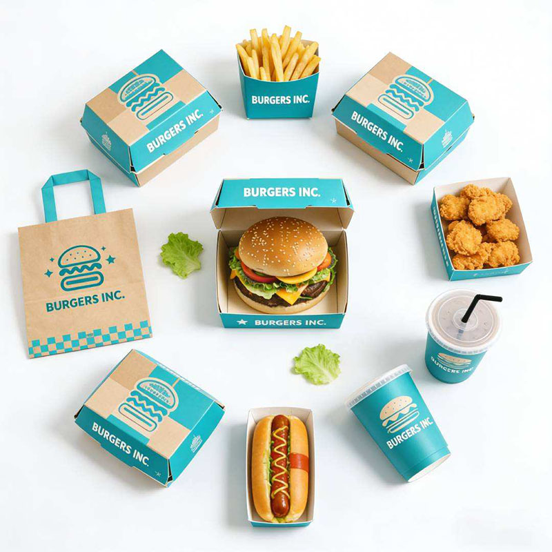 First and foremost, our Custom Fast Food Packaging Set is designed to elevate your brand’s takeout and delivery experience. We craft every piece from food-grade paper materials, combining durability, functionality, and eye-catching branding. This all-in-one packaging solution includes burger boxes, fry containers, chicken boxes, hot dog trays, paper cups, and kraft paper bags. It is the perfect choice for burger joints, fried chicken shops, food trucks, and casual restaurants.