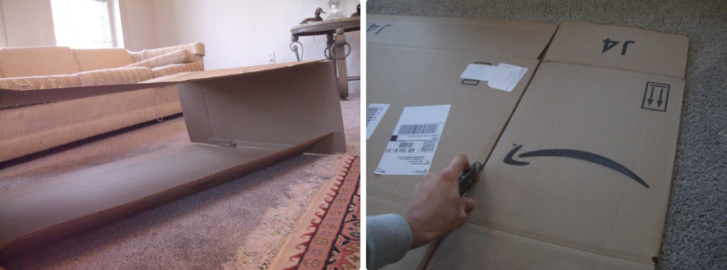 All you need is second hand cardboard, a box cutter (razor blade), and packing tape (in a dispenser works best).