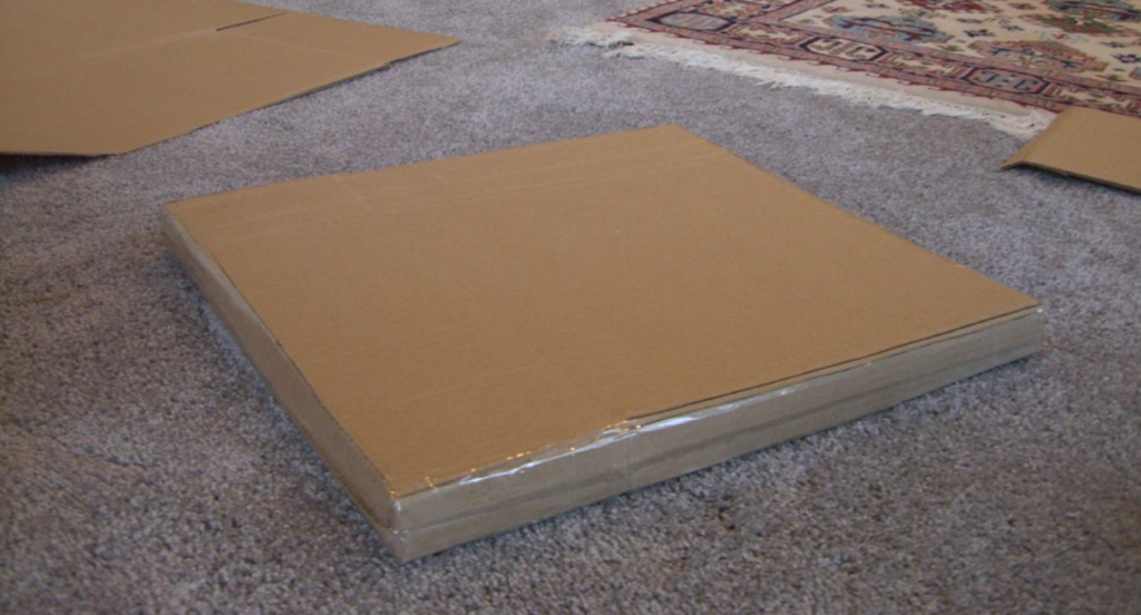 Now there is one long piece of cardboard laid on the floor. Place the item(in this case- a framed picture) on the cardboard where half the width of the item is equal to the space between the item and the edge of the cardboard. (So if you were to fold the cardboard up on the item, it would only be halfway across that side.) From top to bottom, cut very lightly with the box cutter to draw a cut line into the cardboard at the place the item’s edge meets the cardboard.